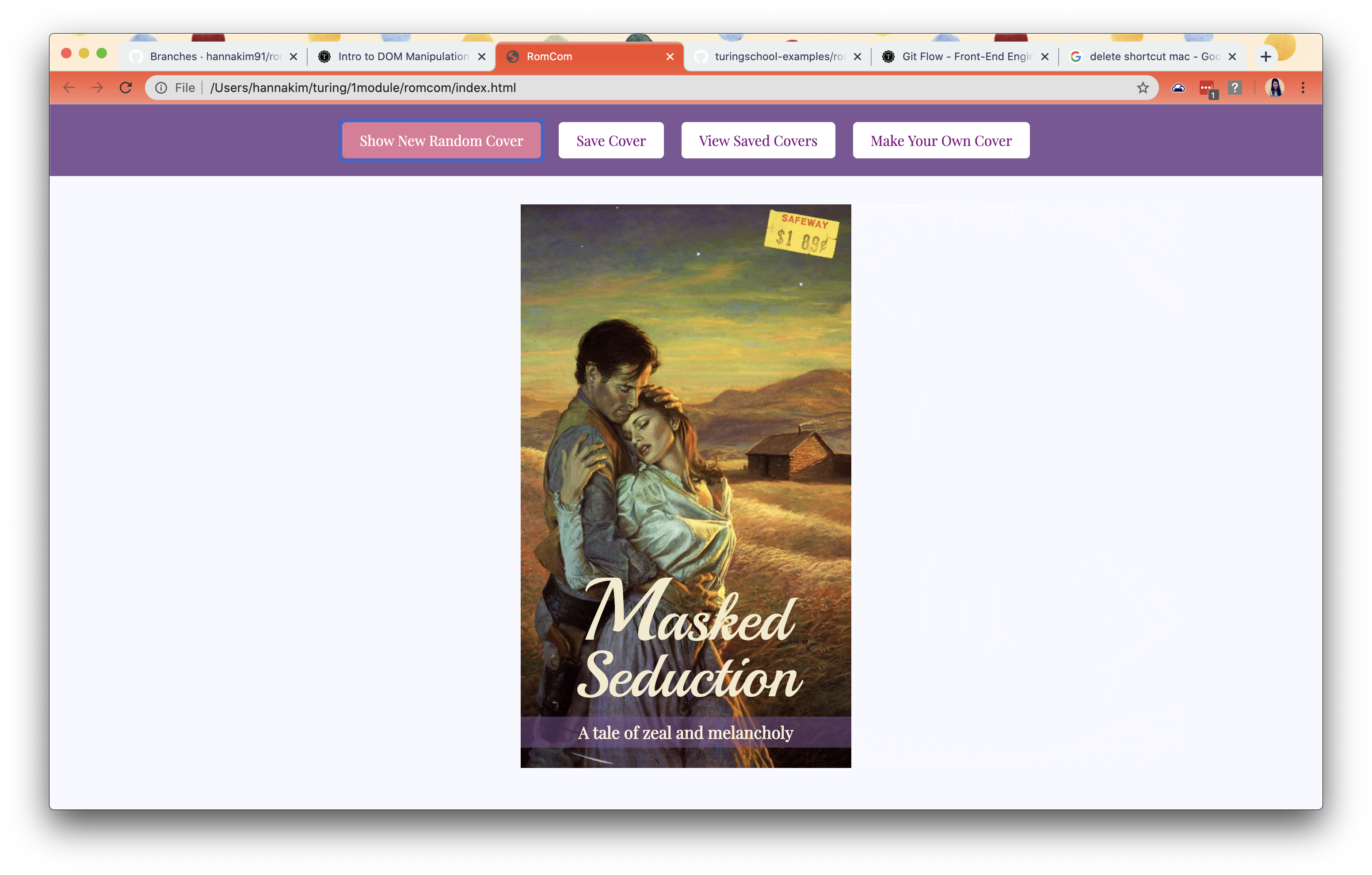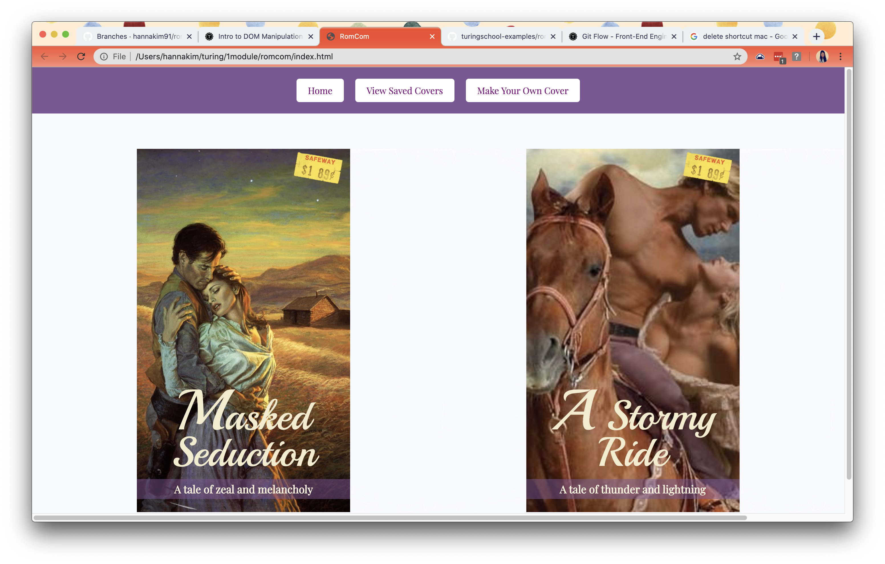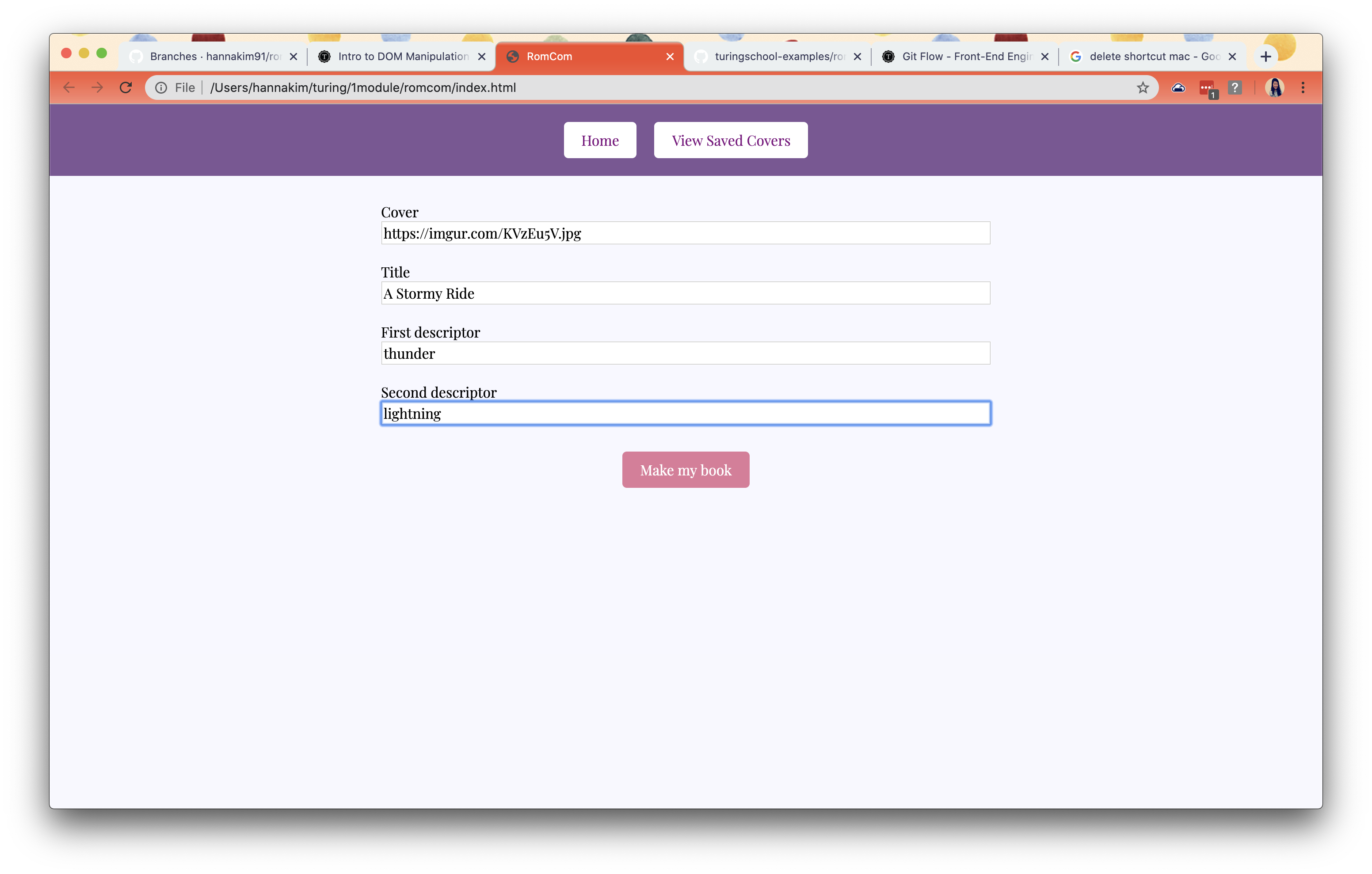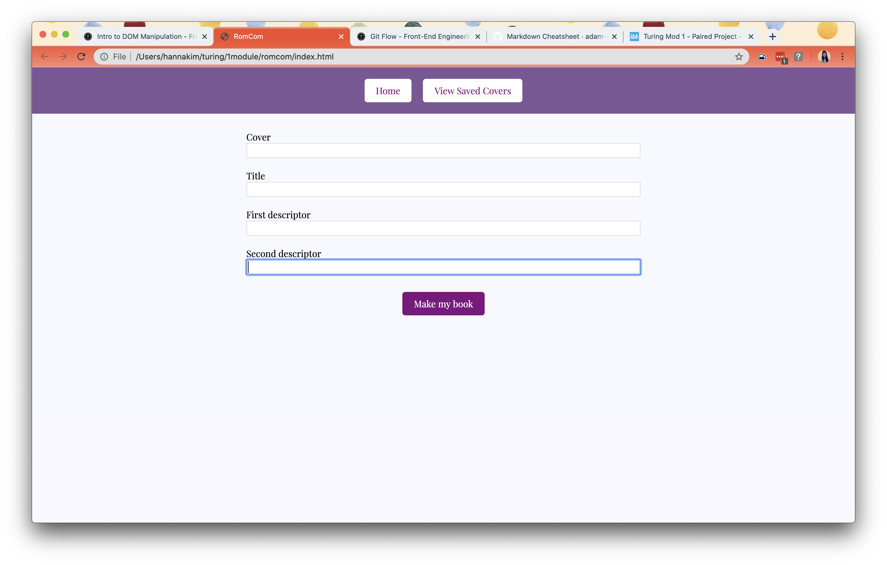 "Make Your Own Cover" Feature: Make my book button brings a user to a form that can be filled with their own RomCom cover ideas.