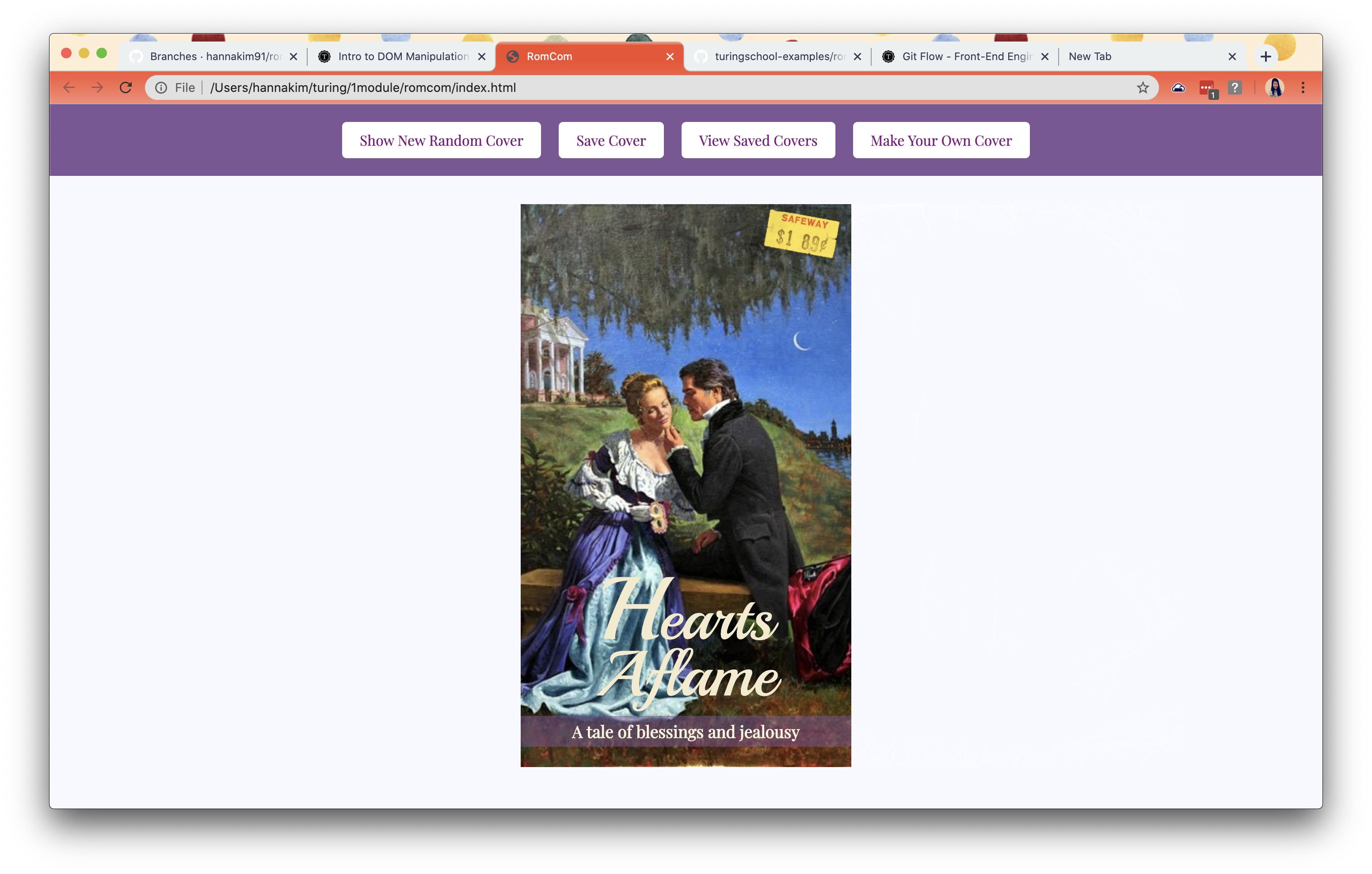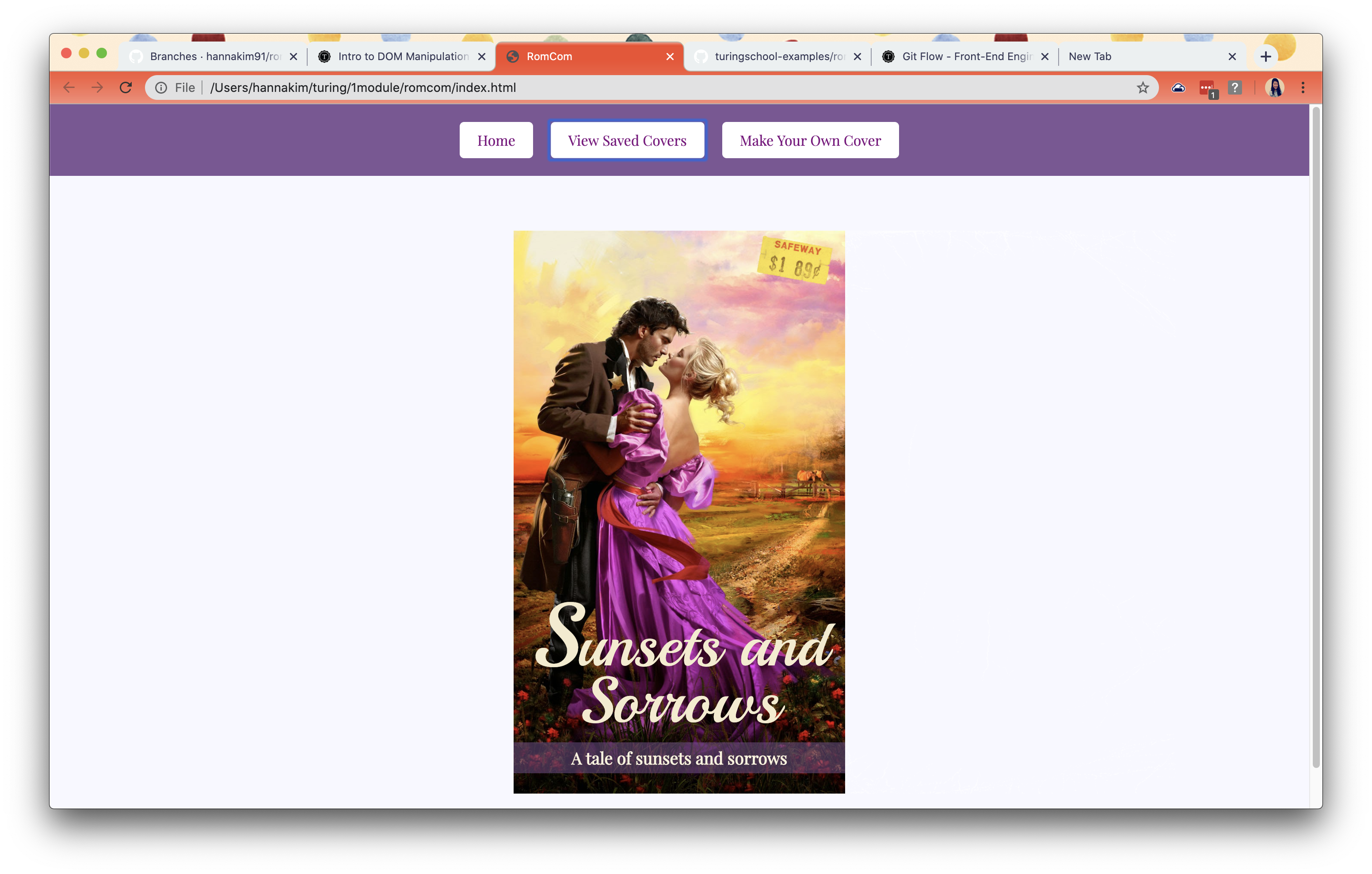 "Make Your Own Cover" Feature: A user can save their own custom RomCom cover by filling in the available fields in this view and hitting the Make my book button.