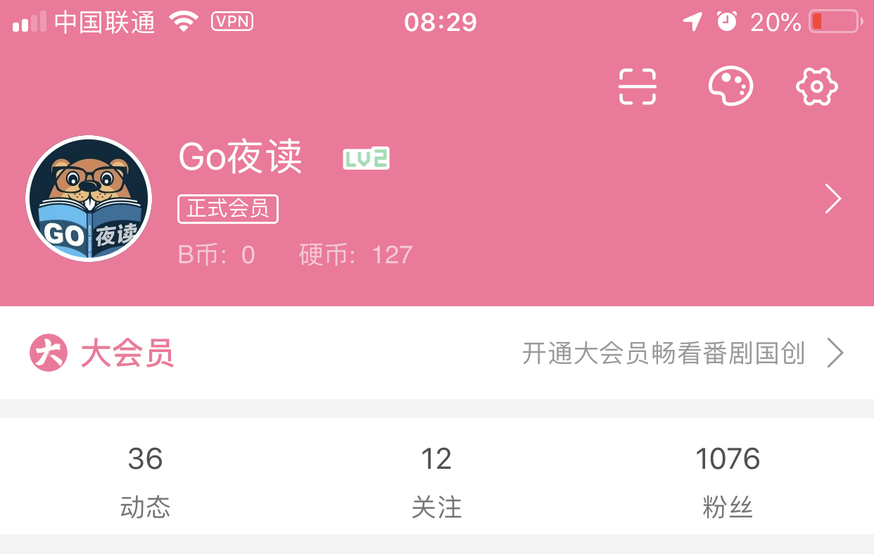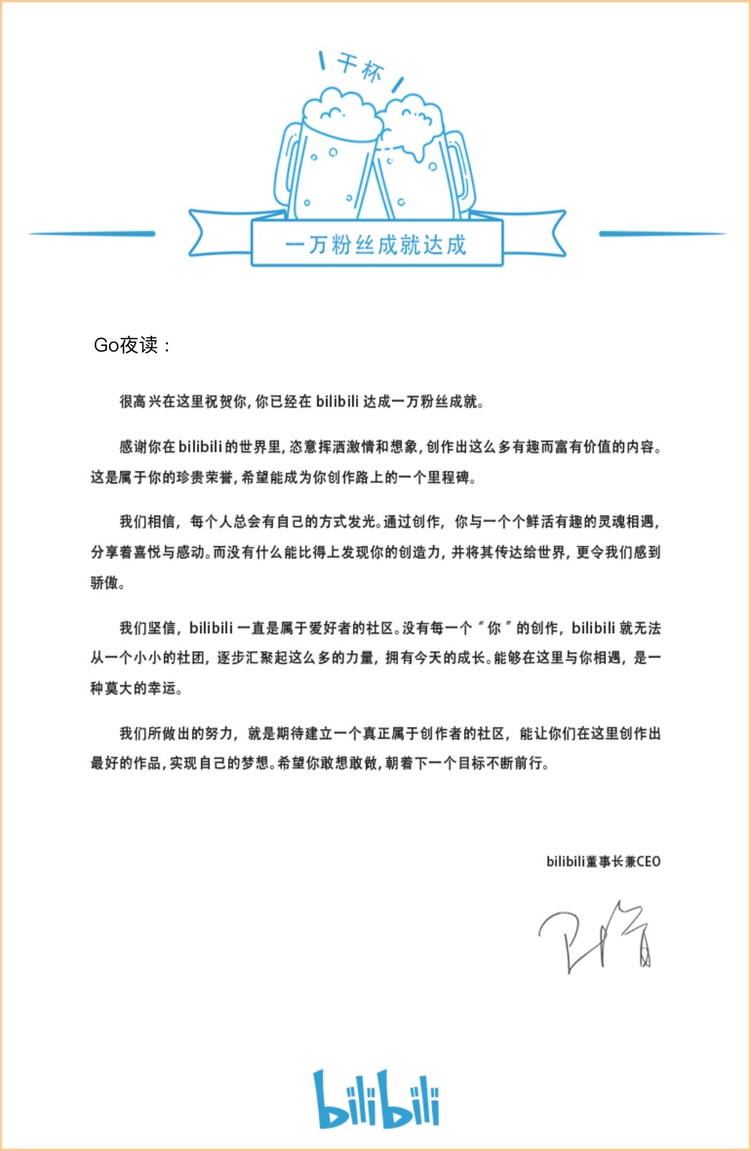 2020-05-12 Go 夜读 Bilibili 关注数突破 1 万,达到一个新的里程碑。